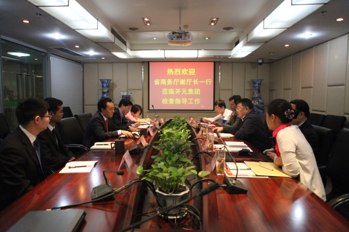 首先,趙董事長對(duì)謝廳長一行的來訪表示了熱烈歡迎,并感謝省商務(wù)廳一直以來對(duì)開元集團(tuán)的支持與政策指導(dǎo)。緊接著,趙董事長就集團(tuán)各個(gè)業(yè)務(wù)板塊的發(fā)展情況向謝廳長作了全面詳實(shí)的報(bào)告,重點(diǎn)介紹了集團(tuán)境外投資的情況,他指出,開元集團(tuán)是四川省“走出去”的代表企業(yè),在老撾、緬甸、加拿大都有投資項(xiàng)目或意向,特別是老撾鉀鹽礦項(xiàng)目,目前已實(shí)現(xiàn)一期投產(chǎn),二期工程建設(shè)也已全面啟動(dòng)。針對(duì)老撾項(xiàng)目,希望省商務(wù)廳給予更多的政策與資金支持。