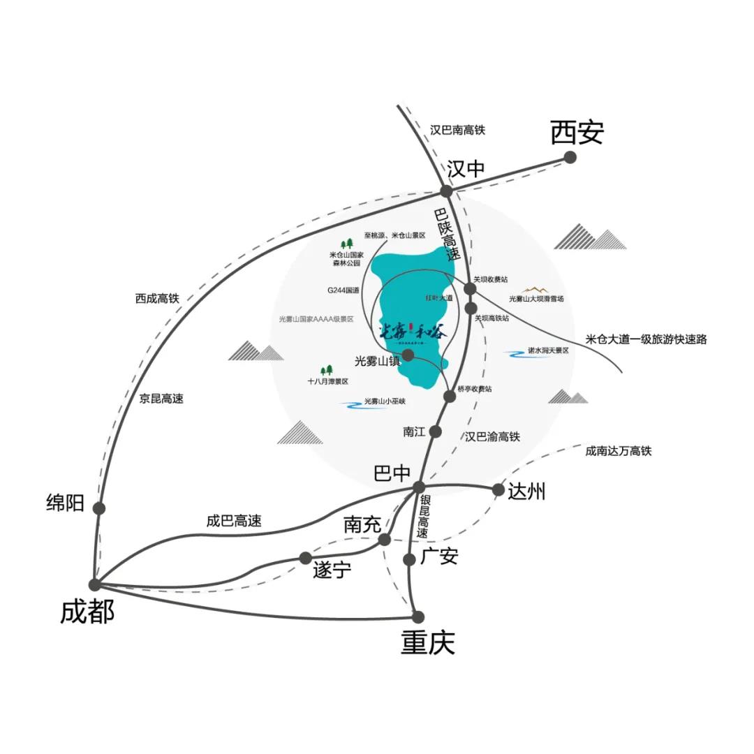 酒店位于四川·巴中市的光霧山鎮(zhèn)——光霧和谷國際森林康養(yǎng)小鎮(zhèn)。背靠光霧山AAAA級風(fēng)景名勝,周邊緊密分布著米倉山國家森林公園、光霧山-諾水河世界地質(zhì)公園、小巫峽、恩陽古鎮(zhèn)、十八月潭等景區(qū)。隨著米倉大道旅游快速路快速建成,這里將成為光霧山度假區(qū)中心樞紐,賓客們在這能包攬自然風(fēng)光,享受完美旅游度假生活。