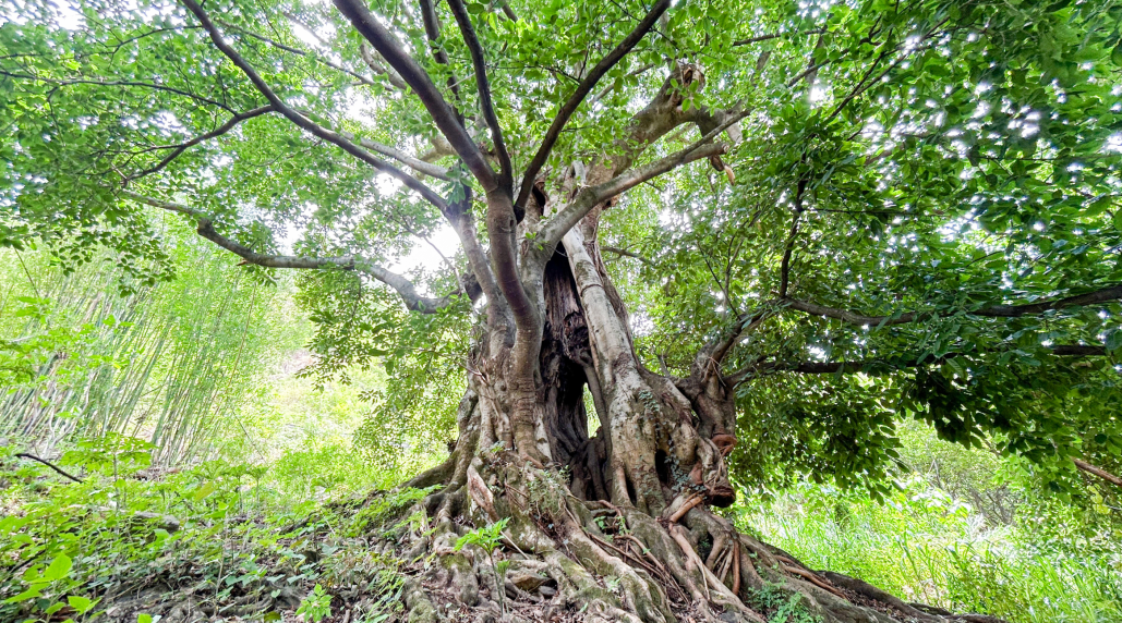 古樹(shù)資源也是海花溝的一大特色。項(xiàng)目范圍內(nèi)有近200棵數(shù)百上千年的古樹(shù)沿主要道路呈帶狀分布,專家一行參觀的是園區(qū)的“千手觀音子母樹(shù)”和“七星古樹(shù)”。子母樹(shù)為同根而生的雙生樹(shù),母樹(shù)根系在十余米外再次萌芽,生長(zhǎng)為子樹(shù)。二者根系相連、枝葉相接、風(fēng)姿相似,因母樹(shù)枝干如手臂向四周伸展,神似千手觀音,故被當(dāng)?shù)卮迕穹Q為“千手觀音子母樹(shù)”。“七星古樹(shù)”因生長(zhǎng)方位分別與北斗七星——天樞、天璇、天璣、天權(quán)、玉衡、開(kāi)陽(yáng)、瑤光對(duì)應(yīng),故此得名。每年農(nóng)歷三月三,七里八鄉(xiāng)的村民在此舉行“斗菜節(jié)”,祭祀樹(shù)神祈福新年。